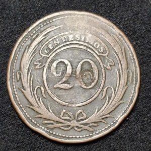 Uruguay – 1854 – 20 Centésimos – **COBRE CLÁSICO** – Cobre, 21.5g, ø 38mm KM# 7 – CG##11.1.A
