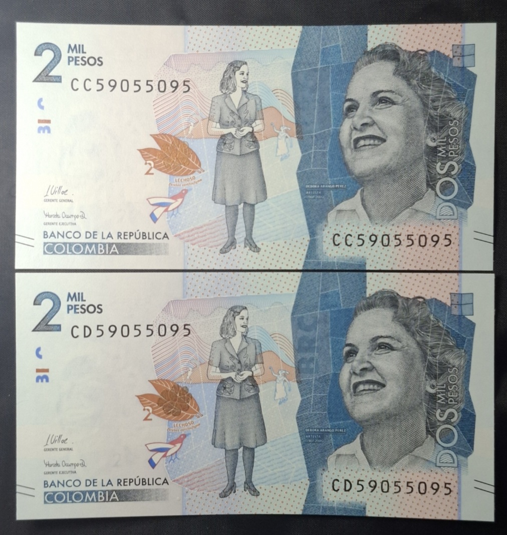 Colombia – 2022 – 2000 Pesos x 2 – 2 Billetes de igual numeración + capicúa – Raro – Unc