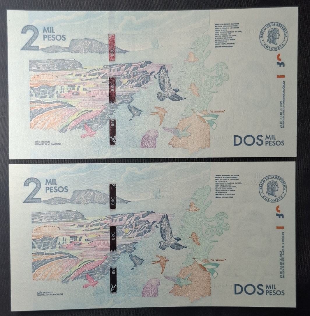 Colombia - 2022 - 2000 Pesos x 2 - 2 Billetes de igual numeración + capicúa - Raro - Unc cantidad