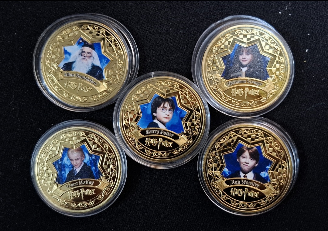 / Harry Potter – Set de 5 medallas de bronce con diseños coloridos – 40mm en Cápsula acrílica –