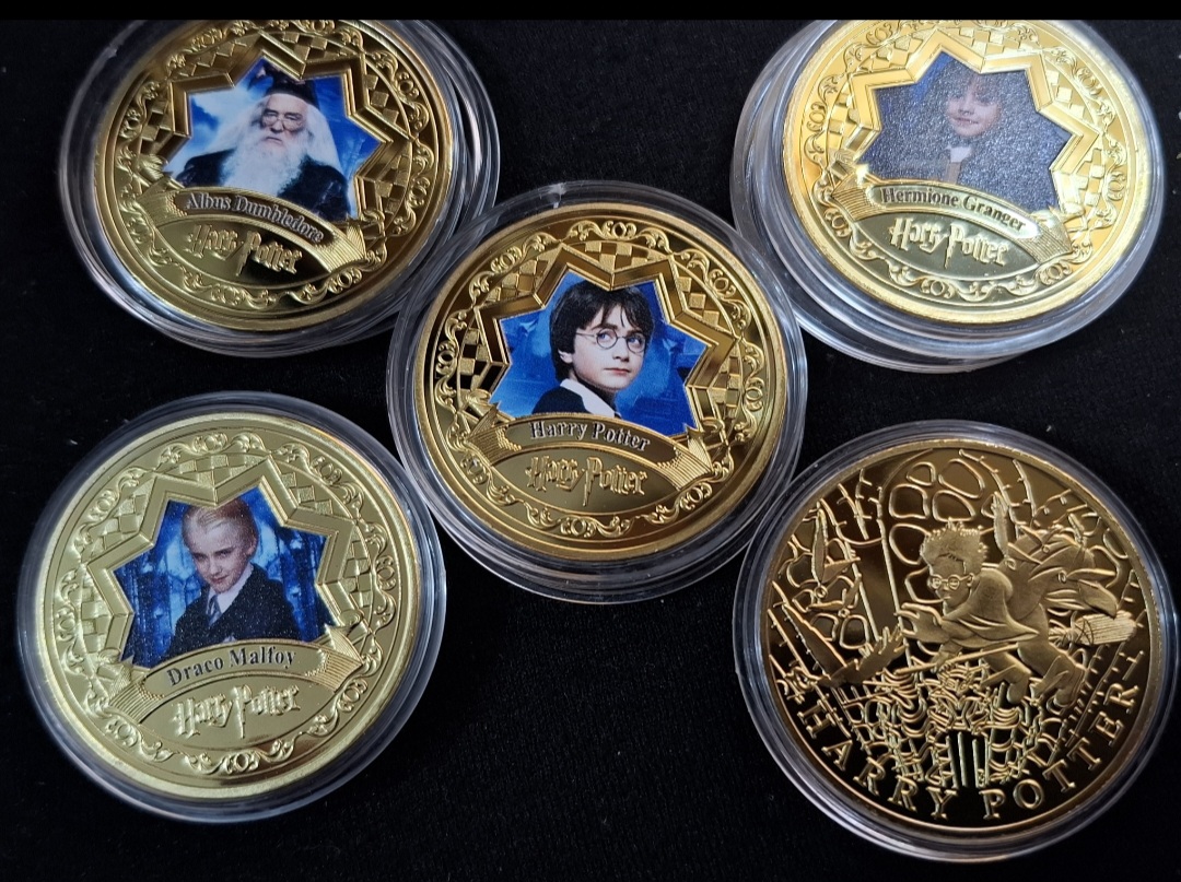 Harry Potter - Set de 5 medallas de bronce con diseños coloridos - 40mm en Cápsula acrílica - cantidad