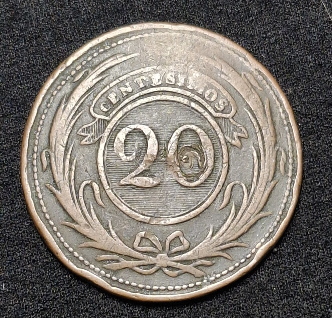 Uruguay – 1854 – 20 Centésimos – **COBRE CLÁSICO** – Cobre, 21.5g, ø 38mm KM# 7 – CG##11.1.A