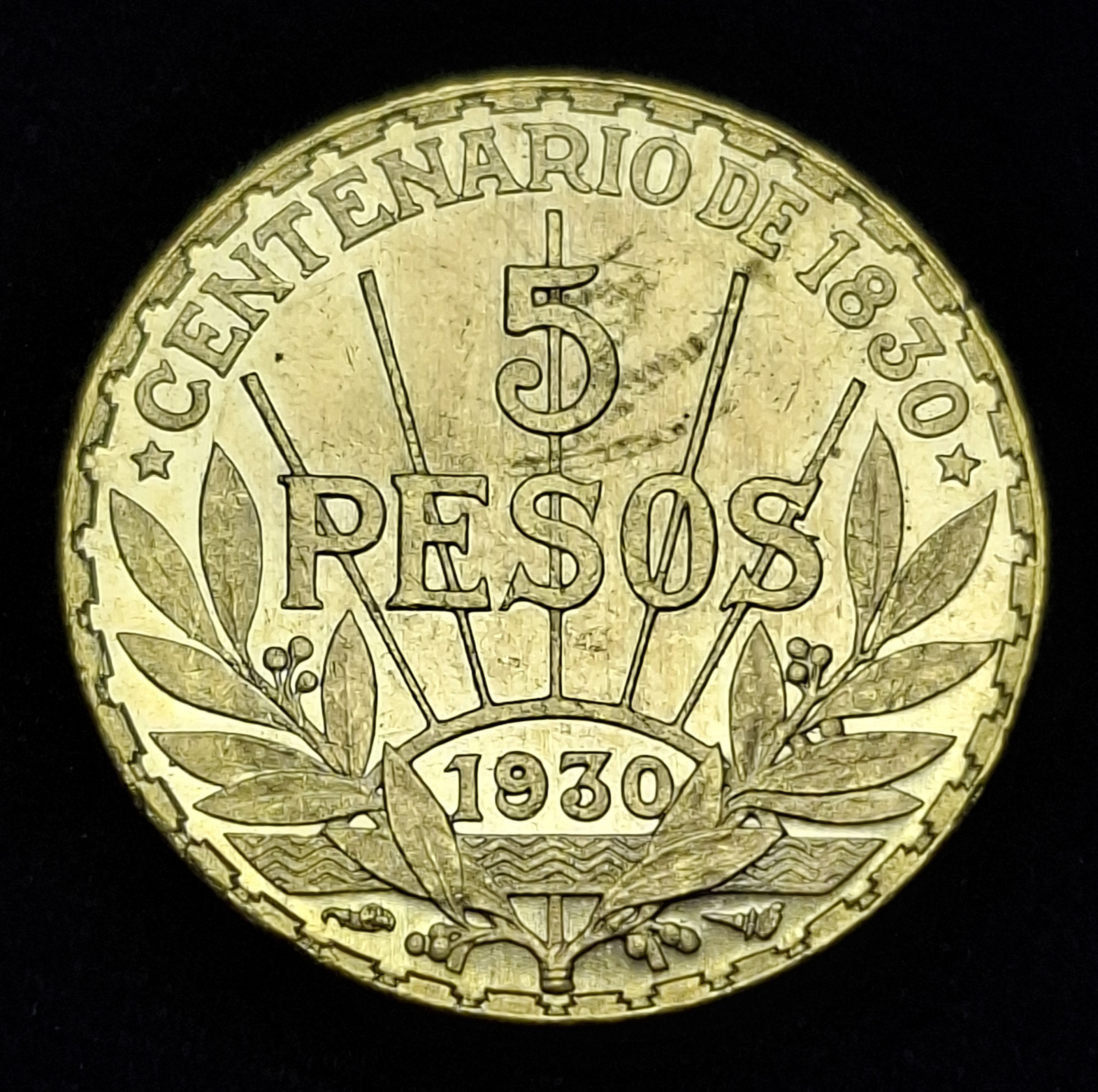 Uruguay – 1930 – 5 Pesos – 100 Aniversario de la Constitución – Oro 0.917, 8.49g, ø 22mm KM# 27 – Escasa – CG##48