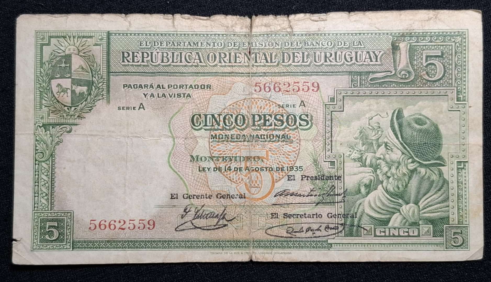 / Uruguay – 1935 – 5 Pesos – CR#9.IV.8 – F