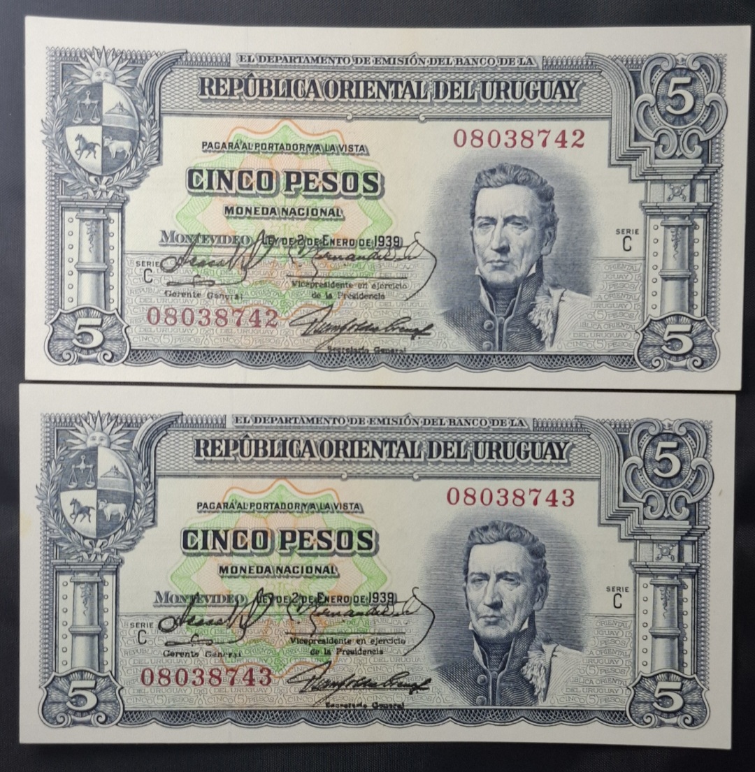 / Uruguay – 1939 – 5 Pesos x 2 – C.R.#10.IV.26 – No común – 2 Correlativos – Unc